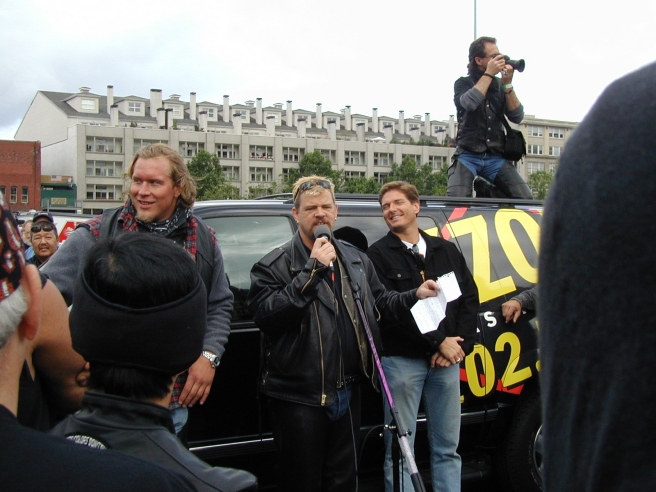Right on time, the announcer called the riders together for the pre-ride meeting. Spike O'Neil of KZOK radio introduce the co-hosts for this year's run: Brad Goode, news anchor for KIRO-TV, and Chad Eaton, defensive tackle for the Seattle Seahawks. Spike, Brad, and Chad would lead the ride out of the Stadium to Pacific Raceways. Troopers and dedicated riders, Spike and Chad had just ridden in earlier this morning from a concert in Eastern Washington. It was 47 degrees and raining when they rode over Snoqualmie Pass. If there were a trophy for Furthest Ridden, they might have to share it!
